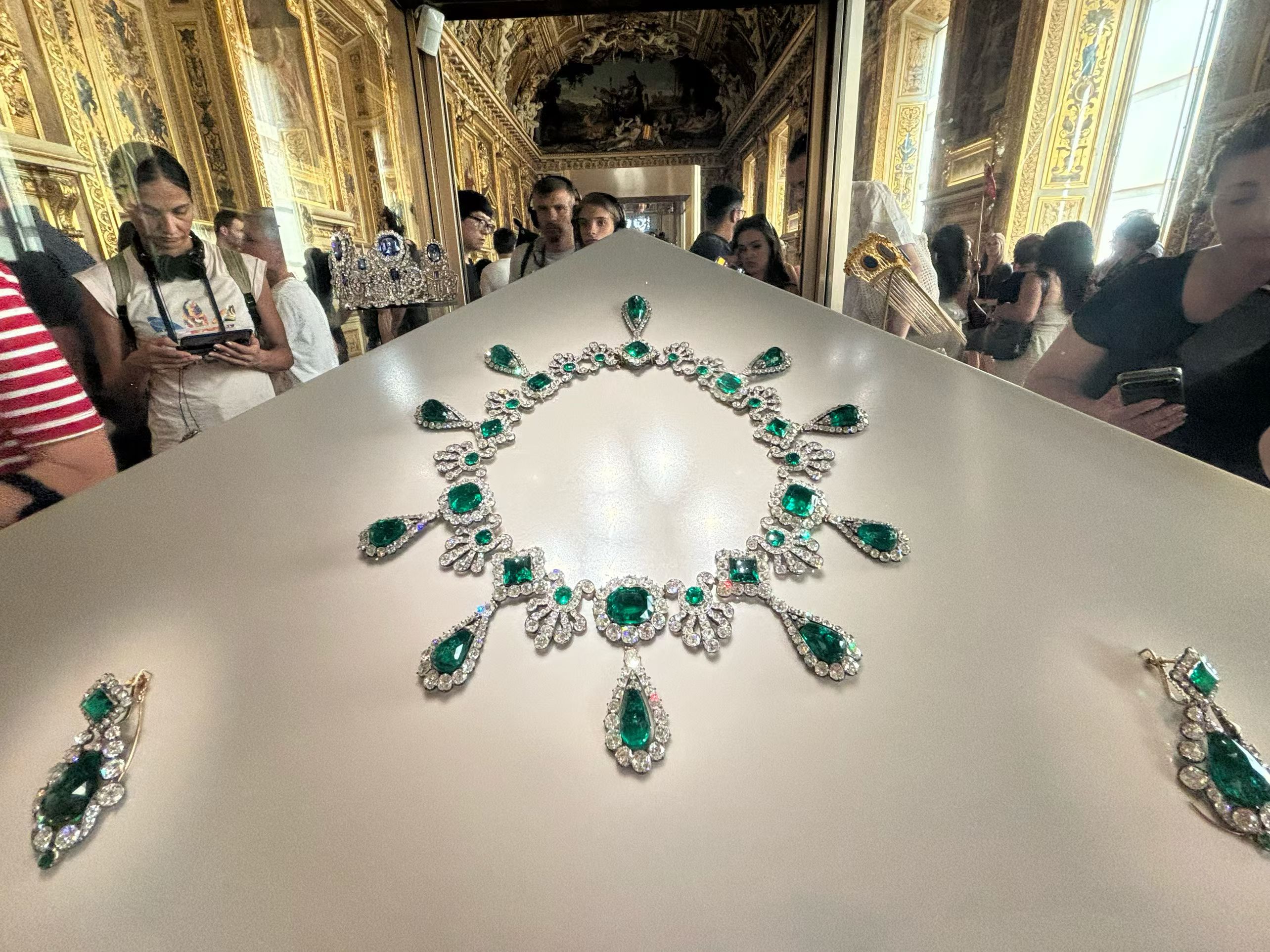而丢失的祖母绿项链和耳环,则是拿破仑一世二婚迎娶奥地利公主玛丽·路易丝时,送上的结婚礼物。这个祖母绿套装包含32颗祖母绿和1138颗钻石,以复杂的菱形和珍珠形状排列,2004年入藏卢浮宫。